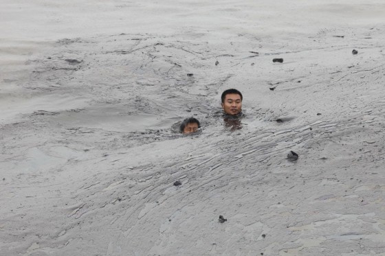 Zheng Zhanhong uses his momentum from jumping into the water, using his hands to swim through the black oil.